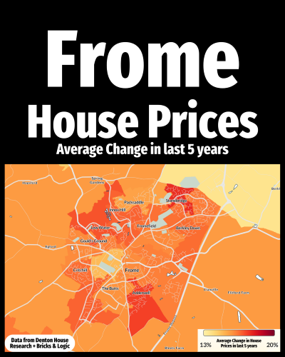 This map shows how house prices have changed across Frome over the past 5 years. Any blue areas shows any drop in house prices. The lighter yellow areas represent the parts of Frome where average house prices have seen smallest rises, the orange shades in the middle increases, while any deeper reds show the strongest house price growth.