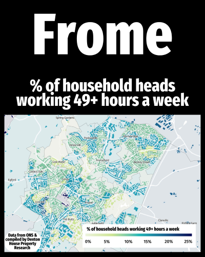 Using data from the Office for National Statistics and the recent Census, this heat map illustrates the percentage of working residents in different areas of Frome who work more than 49 hours per week.
